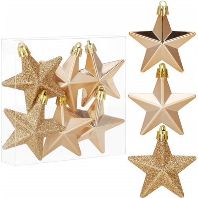 Sada 6 ks zlatých ozdob na stromeček s motivem hvězdiček. Výška ozdoby 7 cm, se třemi vzory, poutko na zavěšení, nerozbitný plastový materiál. Ideální k výzdobě stromečku nebo...