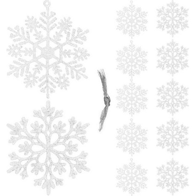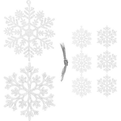 Sada dvanácti kusů sněhových vloček s provázkem na zavěšení. Výška 10 cm, dva vzory vloček, blýskavý povrch se třpytkami, nerozbitný plastový materiál, sněhově bílá barva....