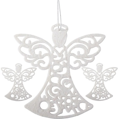 Sada třech kusů vánočních ozdob ve tvaru andělů zdobených třpytkami a provázkem na zavěšení. Výška 10 cm, nerozbitný, plastový materiál. Ideální k výzdobě stromečků nebo jako...