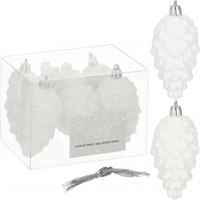 Sada 6 ks bílých ozdob na stromeček s motivem šišky. Výška ozdoby 14 cm, lesklé provedení se třpytkami, poutko na zavěšení, nerozbitný plastový materiál. Ideální k výzdobě...