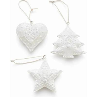 Sada vánočních ozdob na stromeček. Sada obsahuje 8 kusů, motiv - anděl, srdce, strom, hvězda. Rozměry: 4,5 x1 cm, výška 4,5 - 5 cm. Barva: bílá. Materiá : kov.