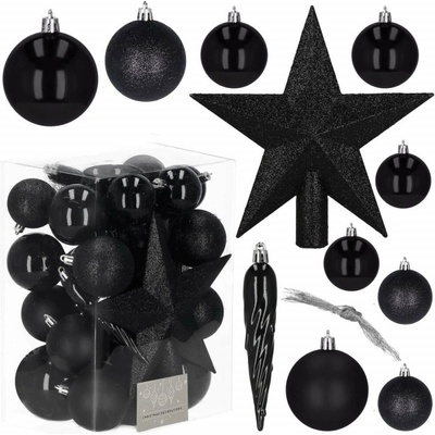 Luxusní 33 dílná sada vánočních ozdob na stromeček. Set tvoří 3 různé vzory ozdob černé barvy + překrásná hvězda na špičku stromku. Vše z nerozbitného plastového materiálu....