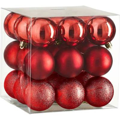 Sada 27 ks plastových ozdob v tradiční červené barvě v lesklém, matném a dekorovaném provedení.S průměrem 6 cm jsou tyto ozdoby dostatečně velké, aby byly viditelné, zároveň se...
