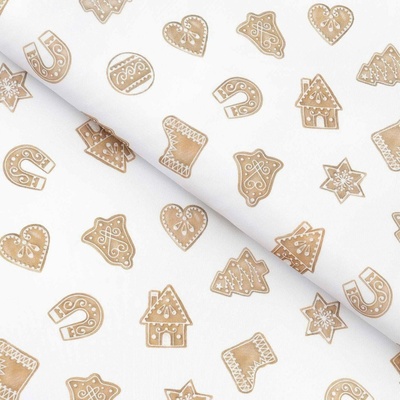 Jednostranná dekorační látka s teflonovou úpravou s vánočním motivem perníčků. Šíře látky je 160 cm a podkladem je bílá barva. Je vyrobená ze 100%...