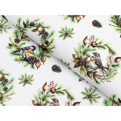 Polyesterová látka s vodoodpudivou a nešpinivou teflonovou úpravou, se vzorem vánočních věnců s ptáčky na bílém podkladu. Je stálobarevná, nesráží se a velmi snadno se udržuje....