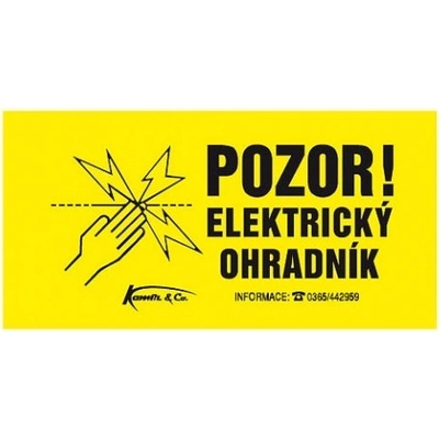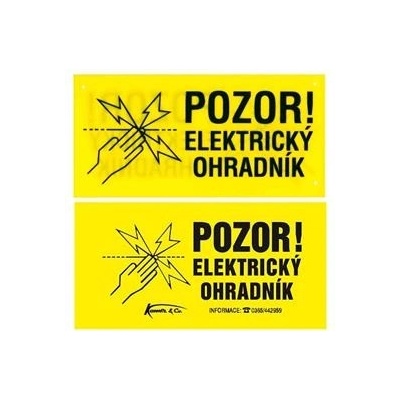 Výstražná cedulka POZOR! ELEKTRICKÝ OHRADNÍK na žlutém plastu s oboustranným potiskem odpovídá normě. Podle předpisů se má výstražná cedulka umístit na vodič elektrického ohradníku na místo, kde lze předpokládat pohyb osob.