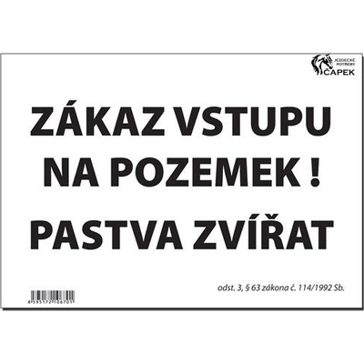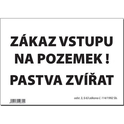 Cedulka A5 z bílého plastu s černým potiskem "ZÁKAZ VSTUPU NA POZEMEK! PASTVA ZVÍŘAT". - Hmotnost v kg: 0,03 - Materiál / složení: plast Podle odst. 3, § 63 zákona č....