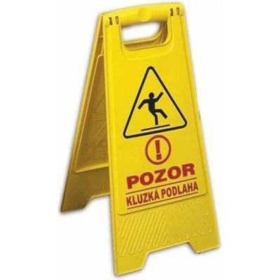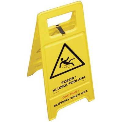 Plastový stojan žluté barvy s oboustranným mezinárodně známým symbolem upozorňuje na mokrou, kluzkou podlahu s nebezpečím uklouznutí a možného zranění. - výstražný plastový...