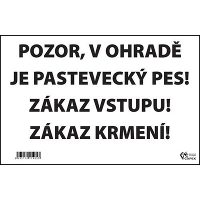 Výstražná cedulka vhodná na upozornění osob, že vstupují na pastevní pozemek hlídaný psem. bílá plastová cedulka s černým potiskem velikost A5 vhodné k připevnění na jakékoliv...