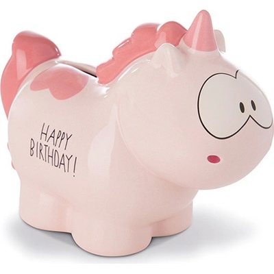 Jednorožec - kvalitní pokladnička značky Nici, barva světle růžová. Vysoce kvalitní pokladnička od značky Nici ve tvaru jednorožce. Na boku má text Happy Birtday!/Všechno...