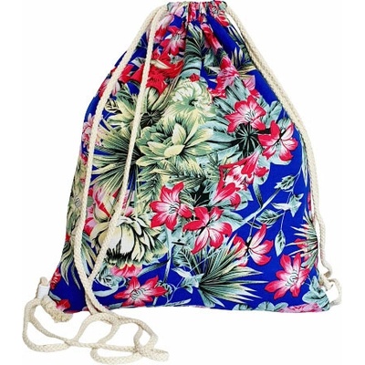 Svěží modrý vak na záda s tropickým květem o rozměru 40x33 cm. Lehký a skladný batůžek na sport i volný čas. Odolný polyester pro každodenní nošení.