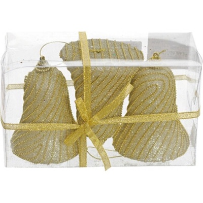 Vánoční závěsná ozdoba ve tvaru zvonku, ve zlaté barvě zdobená korálky. Sada obsahuje tři kusy. Rozměr jedné ozdoby 10x7cm.