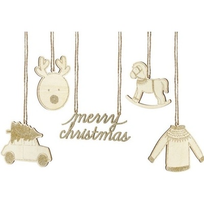 Vánoční ozdoby ze dřeva s třpytkami na jedné straně. Sada obsahuje 10 ks (5 vzorů, každý 2 ks) a 2 m jutové šňůrky, rozměry ozdob jsou cca 6,5-10 x 7-8,5 cm. Balení: 10 ks....