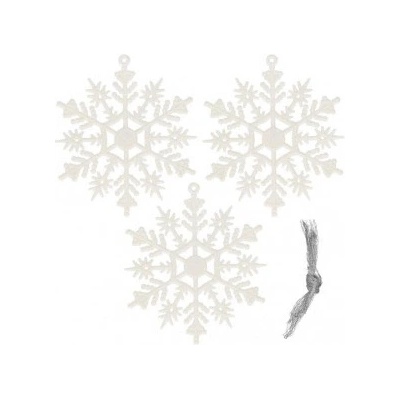 Sada tří kusů sněhových vloček s provázkem na zavěšení. Výška 10 cm, blýskavý povrch se třpytkami, nerozbitný plastový materiál, bílá barva. Ideální k výzdobě stromečků nebo...