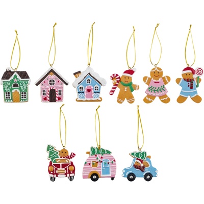 Sada vánočních dekorací k zavěšení. Sada obsahuje 6 dekorací. Rozměry: 5,5 x 0,7 x 5 cm. Materiál: dřevo. Barva: růžová. Tento výrobek není hračka.