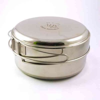 Třídílná ocelová Menážka – sada ocelových turistických nádob ALB Třídílná ocelová jídelní sada – sada ocelových turistických nádob: - velká nádoba s rukojetí; průměr 16 cm; 1,5 l. - malá nádoba s rukojetí; průměr 14 cm; 1,0 l. - víko (talířek) s úchytem; průměr 17 cm;...