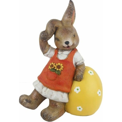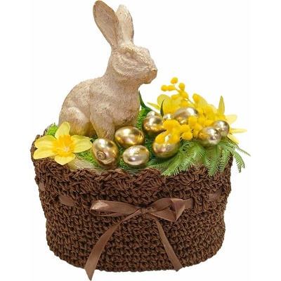 Dekorační velikonoční zajíček. Rozměry: 29 x 17,5 x 39,2 cm. Materiál: magnesium. Barva: hnědá, žlutá, oranžová. Není hračka. Určeno do vnitřních prostor.