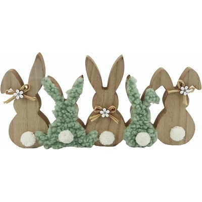 Dřevění velikonoční dekorace zajíčci. Rozměry: 30 x 2 x 14,5 cm. Materiál: dřevo, textil. Není hračka. Určeno do vnitřních prostor.