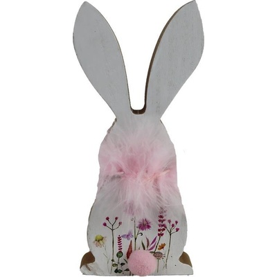 Dekorační velikonoční zajíc. Rozměry: 8,5 x 2,5 x 19,5 cm. Materiál: dřevo, textil. Barva: bílá, růžová. Tento výrobek není hračka.