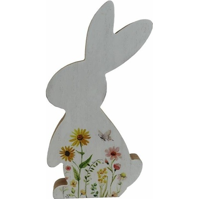 Dekorační velikonoční zajíček. Rozměry: 10 x 2 x 18 cm. Materiál: dřevo. Barva: bílá, žlutá, zelená. Není hračka. Určeno do vnitřních prostor.