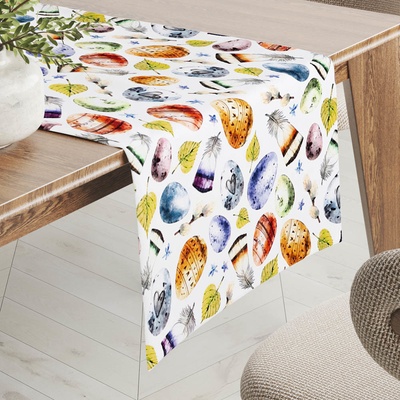Dekorační běhoun na jídelní stůl s velikonočním vzorem barevných kraslic a pírek na bílém podkladu, vyrobený ze 100%...