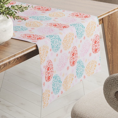 Dekorační běhoun na jídelní stůl s velikonočním vzorem barevných kraslic na bílém podkladu, vyrobený ze 100%...