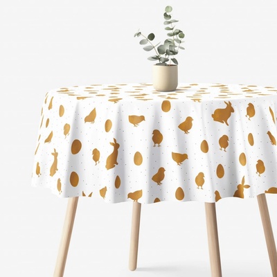 Bavlněný kulatý ubrus s motivem zlatých velikonočních symbolů na bílém. Je vyrobený z velmi pevné 100% bavlny (gramáž 190g/m2). Ubrus velmi dobře drží tvar a hodí se na...