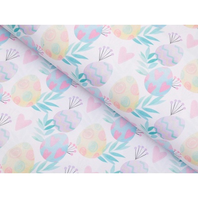 Dekorační běhoun na jídelní stůl s velikonočním vzorem pastelových kraslic na bílém podkladu, vyrobený ze 100%...
