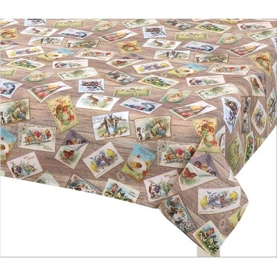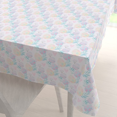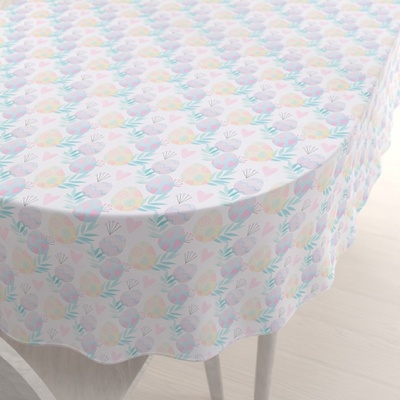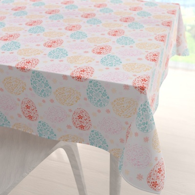 Teflonový obdélníkový ubrus na jídelní stůl s velikonočním vzorem pastelových kraslic na bílém podkladu, vyrobený ze 100% polyesterové látky s vodoodpudivou a nešpinivou...