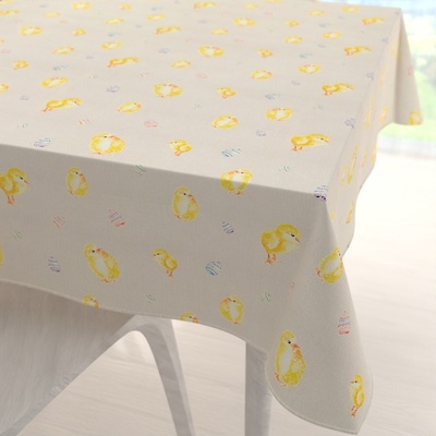 Teflonový čtvercový ubrus na jídelní stůl s velikonočním vzorem kuřátek a kraslic na béžovém podkladu, vyrobený ze 100% polyesterové látky s vodoodpudivou a nešpinivou...