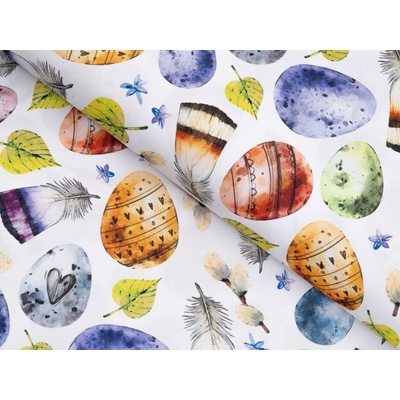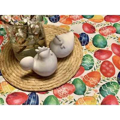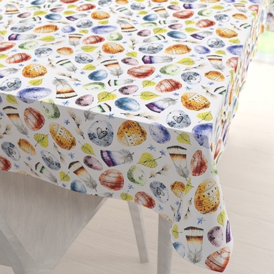 Teflonový obdélníkový ubrus na jídelní stůl s velikonočním vzorem barevných kraslic a pírek na bílém podkladu, vyrobený ze 100% polyesterové látky s vodoodpudivou a nešpinivou...
