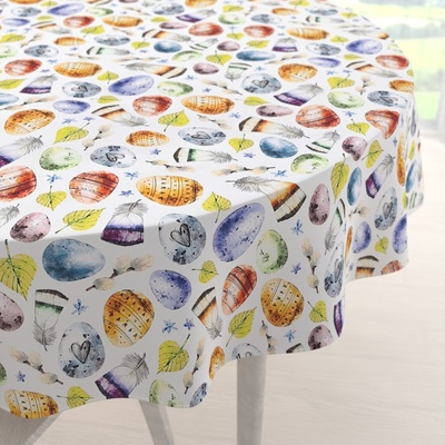 Teflonový kulatý ubrus na jídelní stůl s velikonočním vzorem barevných kraslic a pírek na bílém podkladu, vyrobený ze 100% polyesterové látky s vodoodpudivou a nešpinivou...