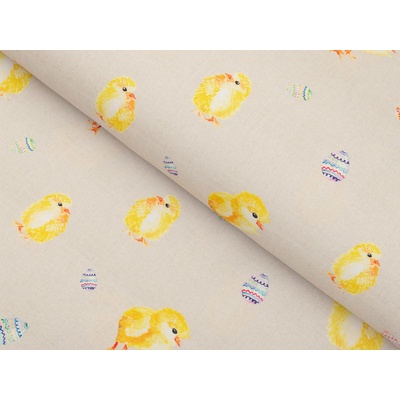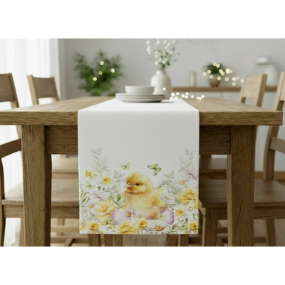 Dekorační běhoun na jídelní stůl s velikonočním vzorem kuřátek a kraslic na béžovém podkladu, vyrobený ze 100%...