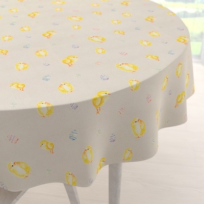 Teflonový kulatý ubrus na jídelní stůl s velikonočním vzorem kuřátek a kraslic na béžovém podkladu, vyrobený ze 100% polyesterové látky s vodoodpudivou a nešpinivou teflonovou...