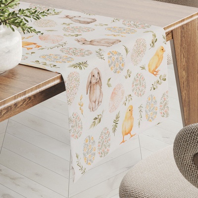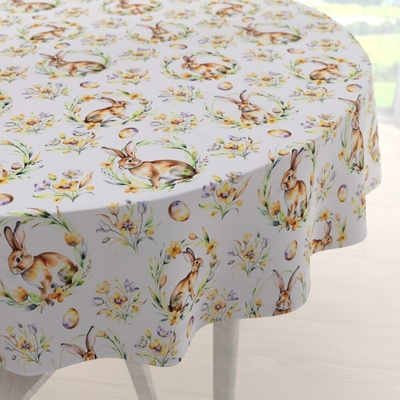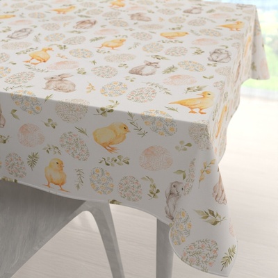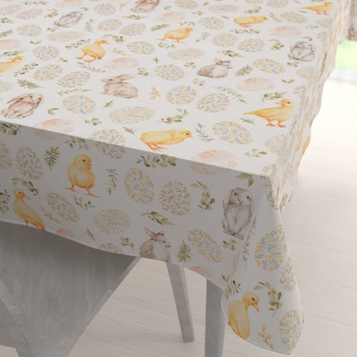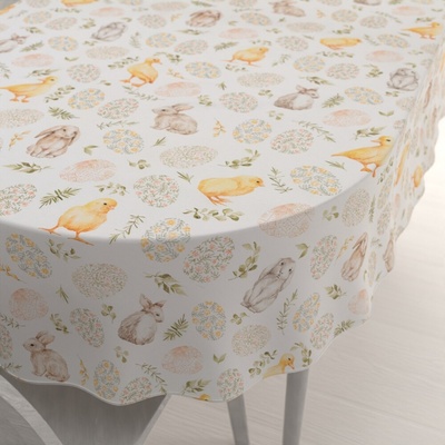 Teflonový obdélníkový ubrus na jídelní stůl s velikonočním vzorem zajíčků na bílém podkladu, vyrobený ze 100% polyesterové látky s vodoodpudivou a nešpinivou teflonovou úpravou....