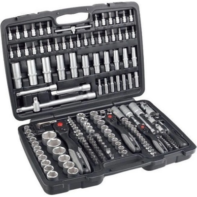 Sada 172ks obsahuje: 3x ráčna, nástrčné hlavice, zástrčné hlavice, klíč na svíčky, adaptér s otvorem, prodlužovací nástavec, adaptér na bity, bity, šroubovák, imbus. Kufr 44x33x9 cm. Obsah sady: 3x ráčna - 1/4", 3/8" a 1/2" 2x vratidlo - 1/4" a 1/2" 2x prodloužení 1/2"...