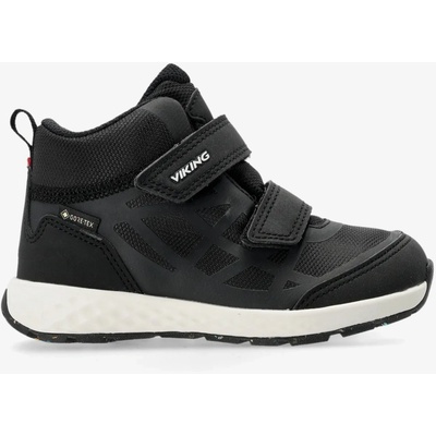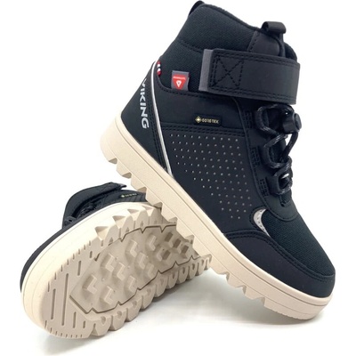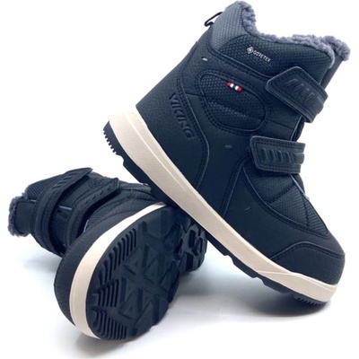 Moderní chlapecké zimní boty Viking Eagle Warm GTX v černé barvě s klasickou bílou podrážkou, která je ze spodní strany v barvě přírodní gumy. Vkusná kombinace kůže a textilních...