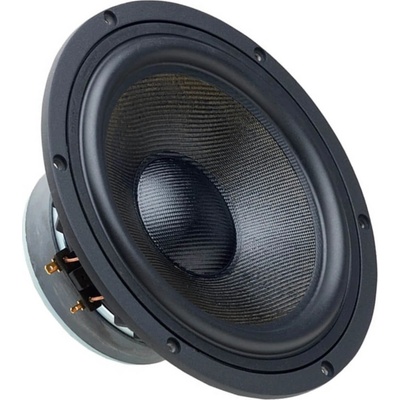 Silný 20 cm (8") Hi-Fi basový reproduktor s 35 mm kmitací cívkou pro vysoký výkon. Elastické gumové uchycení papírové membrány.