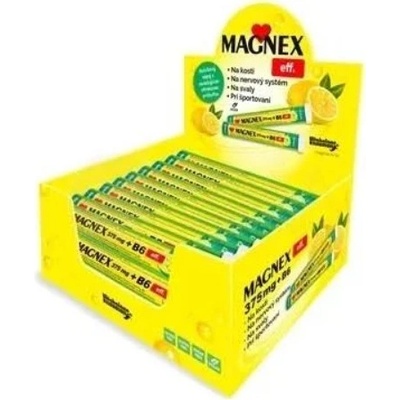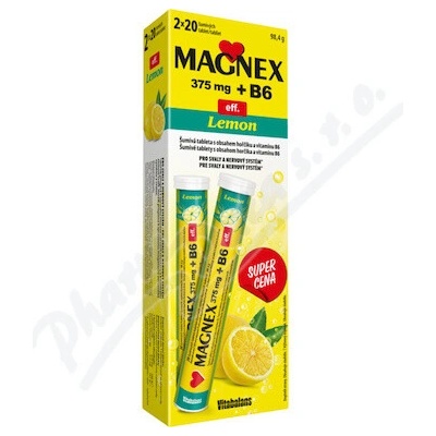- Magnex 375 mg + B6 šumivé tablety: snadný způsob, jak přijmout denní dávku hořčíku! - Díky těmto ve vodě rozpusným tabletám si můžete vychutnat nápoj s citronovou příchutí a vysokým obsahem horčíku. - Hořčík je důležitým minerálem zejména pro svaly a srdce, neboť...