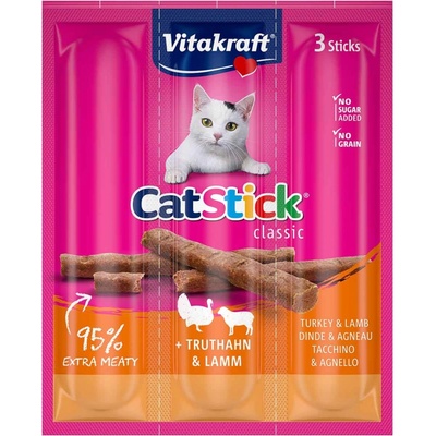 Vitakraft Cat Stick mini Turkey + Lamb 3 x 6 g Šťavnaté tyčinky s masem z krůty a jehněte. - Doplňkové krmivo pro dospělé kočky. - Vhodné jako chutný snack. Složení: maso a produkty živočišného původu, sušené krmné kvasnice, minerální látky, cukr. Jakostní...