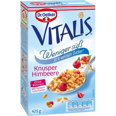 Křupavé malinové cereálie s nižším obsahem cukru od výrobce Dr.Oetker.