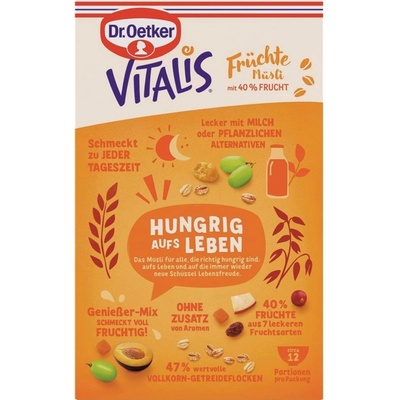 Dr.Oetker Vitalis ovocné musli 500g velmi chutné musli s 40% obsahem ovoce vylepená receptura Složení: 27% celozrnných ovesných vloček, rozinky, sušené hrušky, 11% celozrnných...
