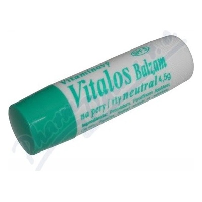 Vitalos balzám na rty s obsahem vitamínů, neutral: vyživuje a hydratuje pokožku, působí hojivě na popraskané a vysušené rty, chrání před slunečním zářením (SPF 5).