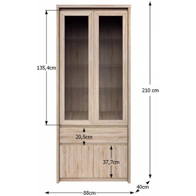 VlastnostiModel Vitrína Materiál povrchu dvířek Laminát Typ povrchové úpravy rámu Matný Typ dveří Dvířka s pantem Materiál polic Sklo Dodatečné informace Čelní plochy bez...