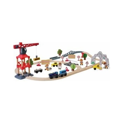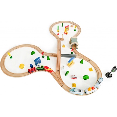 DŘEVĚNÝ VLAK 69 DÍLKŮ ZNAČKY ECOTOYS Vlak na baterie je součástí balení Pevná dřevěná konstrukce Dopravní značky a dřevěné keře Dvě lokomotivy a čtyři vagóny Tunel Hračkový...