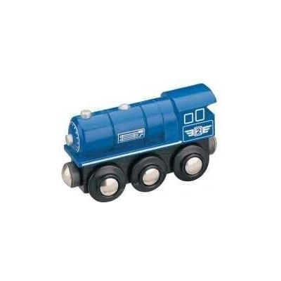 Modrá parní dřevěná lokomotiva pro vláčkodráhy. Ostatní vagónky se připojují pomocí magnetů, které jsou vepředu i vzadu na mašince.