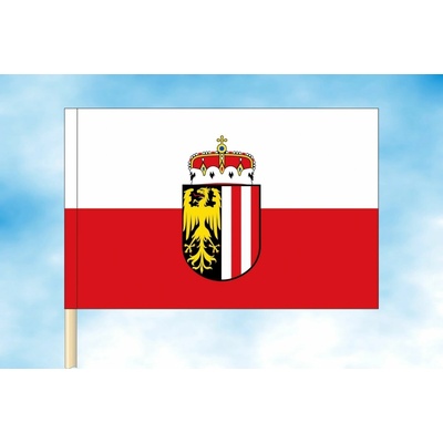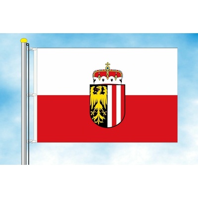Horní Rakousko vlajka Vlajka Horních Rakous je tvořena dvěma vodorovnými pruhy v barvách bílá a červená, uprostřed doplněná zemským znakem s orlem a červeno-bílým štítem, erb...