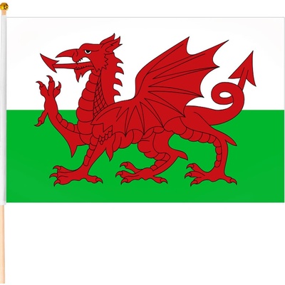 Oficiální vlajka Walesu Rozměry vlajky: 45 x 30 cmMateriál: 100% polyesterDélka dřevěné tyče: 61 cm *Horní zakončení vlajky obsahuje zlatou plastovou kouli nebo béžovou...