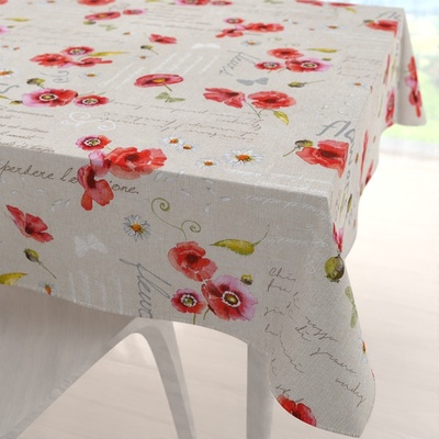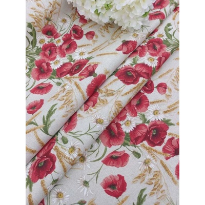 Čtvercový dekorační ubrus na stůl se vzorem vlčích máků a kopretin na režném podkladu. Je ušitý z kvalitní a pevné látky z 55% bavlny a 45% polyesteru. Gramáž látky je 190 g/m2....