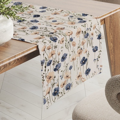 Dekorační běhoun na jídelní stůl se vzorem modro-hnědých vlčích máků na světle vanilkovém podkladu. Je ušitý z hustě tkaného 100% bavlněného plátna s certifikátem zdravotní...